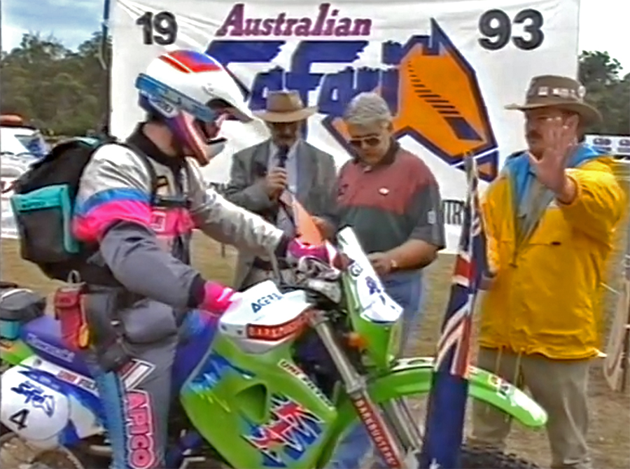 Michael Goddard entered the Wynn's/Australian/Australasian Safari 8 times and won twice, in 1988 on a Honda NXR650 and in 1993 on a Kawasaki KLX650R. The KLX650R was basically standard, with the addition of an Acerbis long range fuel tank, stronger bash plate, barkbusters and different tyres. He is pictured below (Far Left) after winning in 1988, and below that, at the start of the 1993 Safari.